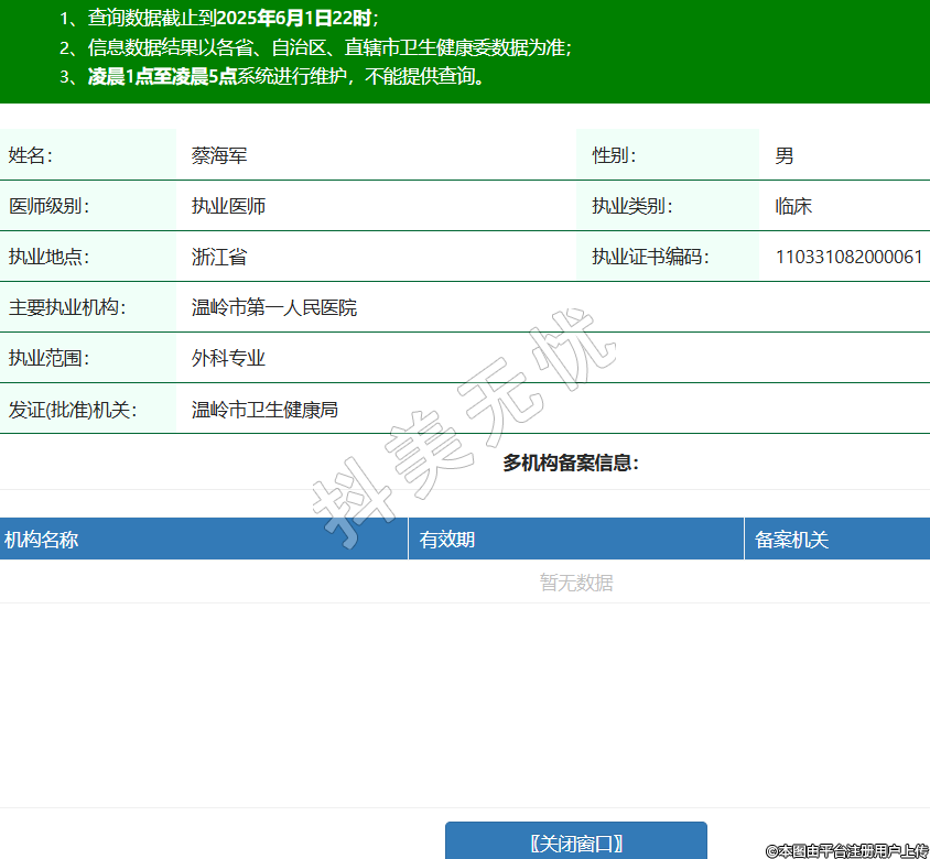 姓名:蔡海軍性別:男醫(yī)師級(jí)別:執(zhí)業(yè)醫(yī)師執(zhí)業(yè)類別:臨床執(zhí)業(yè)地點(diǎn):浙江省執(zhí)業(yè)證書(shū)編碼:110331082000061主要執(zhí)業(yè)機(jī)構(gòu):溫嶺市第一人民醫(yī)院執(zhí)業(yè)范圍:外科專業(yè)發(fā)證(批準(zhǔn))機(jī)關(guān):溫嶺市衛(wèi)生健康局 -