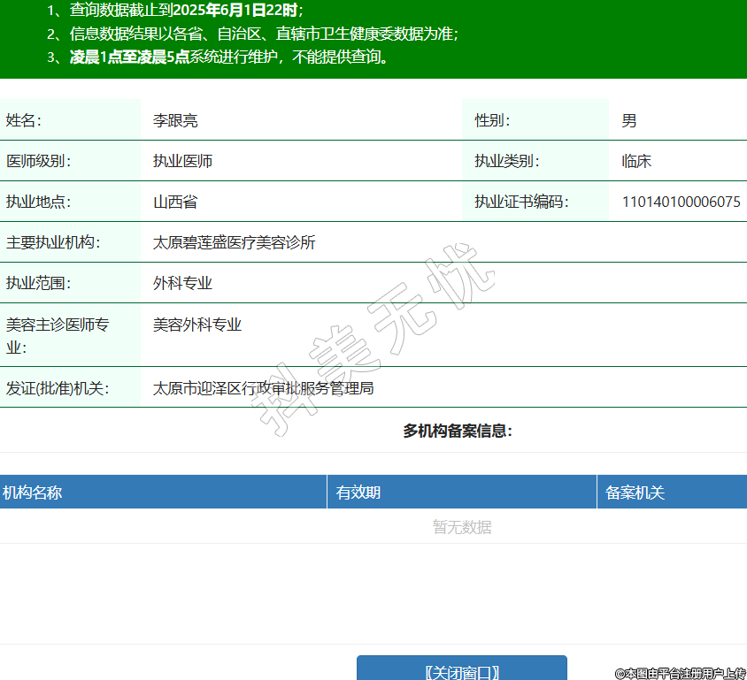 姓名:李跟亮性別:男醫(yī)師級別:執(zhí)業(yè)醫(yī)師執(zhí)業(yè)類別:臨床執(zhí)業(yè)地點:山西省執(zhí)業(yè)證書編碼:110140100006075主要執(zhí)業(yè)機構(gòu):太原碧蓮盛醫(yī)療美容診所執(zhí)業(yè)范圍:外科專業(yè)美容主診醫(yī)師專業(yè):美容外科專業(yè)發(fā)證(批準(zhǔn))機關(guān):太原市迎澤區(qū)行政審批服務(wù)管理局 -