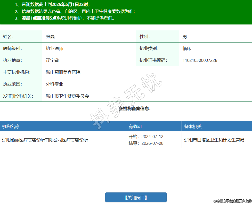 名:張磊性別:男醫(yī)師級別:執(zhí)業(yè)醫(yī)師執(zhí)業(yè)類別:臨床執(zhí)業(yè)地點:遼寧省執(zhí)業(yè)證書編碼:110210300007226主要執(zhí)業(yè)機構(gòu):鞍山燕麗美容醫(yī)院執(zhí)業(yè)范圍:外科專業(yè)發(fā)證(批準)機關(guān):鞍山市衛(wèi)生健康委員會多機構(gòu)備案信息:機構(gòu)名稱 有效期 備案機關(guān) 遼陽燕麗醫(yī)療美容診所有限公司醫(yī)療美容診所 開始:2024-07-12結(jié)束:2026-07-08遼陽市白塔區(qū)衛(wèi)生和計劃生育局 -