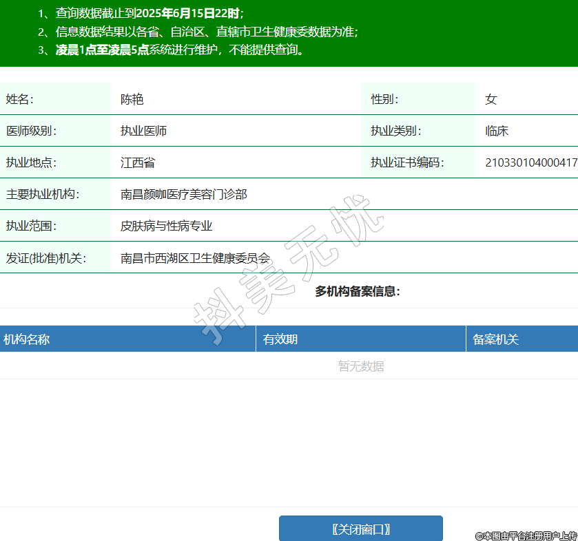 姓名:陳艷性別:女醫(yī)師級別:執(zhí)業(yè)醫(yī)師執(zhí)業(yè)類別:臨床執(zhí)業(yè)地點(diǎn):江西省執(zhí)業(yè)證書編碼:210330104000417主要執(zhí)業(yè)機(jī)構(gòu):南昌顏咖醫(yī)療美容門診部執(zhí)業(yè)范圍:皮膚病與性病專業(yè)發(fā)證(批準(zhǔn))機(jī)關(guān):南昌市西湖區(qū)衛(wèi)生健康委員會(huì) -