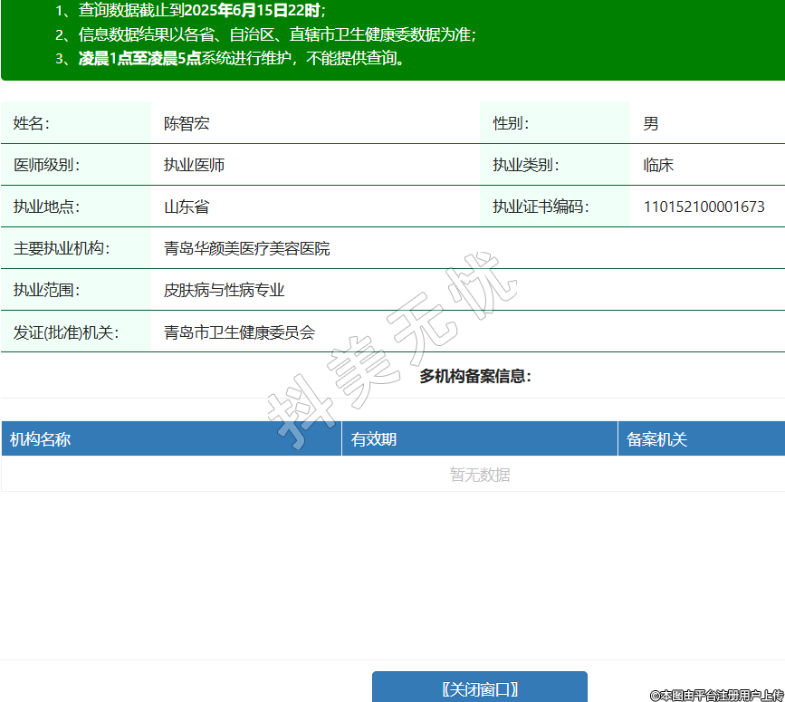 姓名:陳智宏性別:男醫(yī)師級(jí)別:執(zhí)業(yè)醫(yī)師執(zhí)業(yè)類別:臨床執(zhí)業(yè)地點(diǎn):山東省執(zhí)業(yè)證書編碼:110152100001673主要執(zhí)業(yè)機(jī)構(gòu):青島華顏美醫(yī)療美容醫(yī)院執(zhí)業(yè)范圍:皮膚病與性病專業(yè)發(fā)證(批準(zhǔn))機(jī)關(guān):青島市衛(wèi)生健康委員會(huì) -