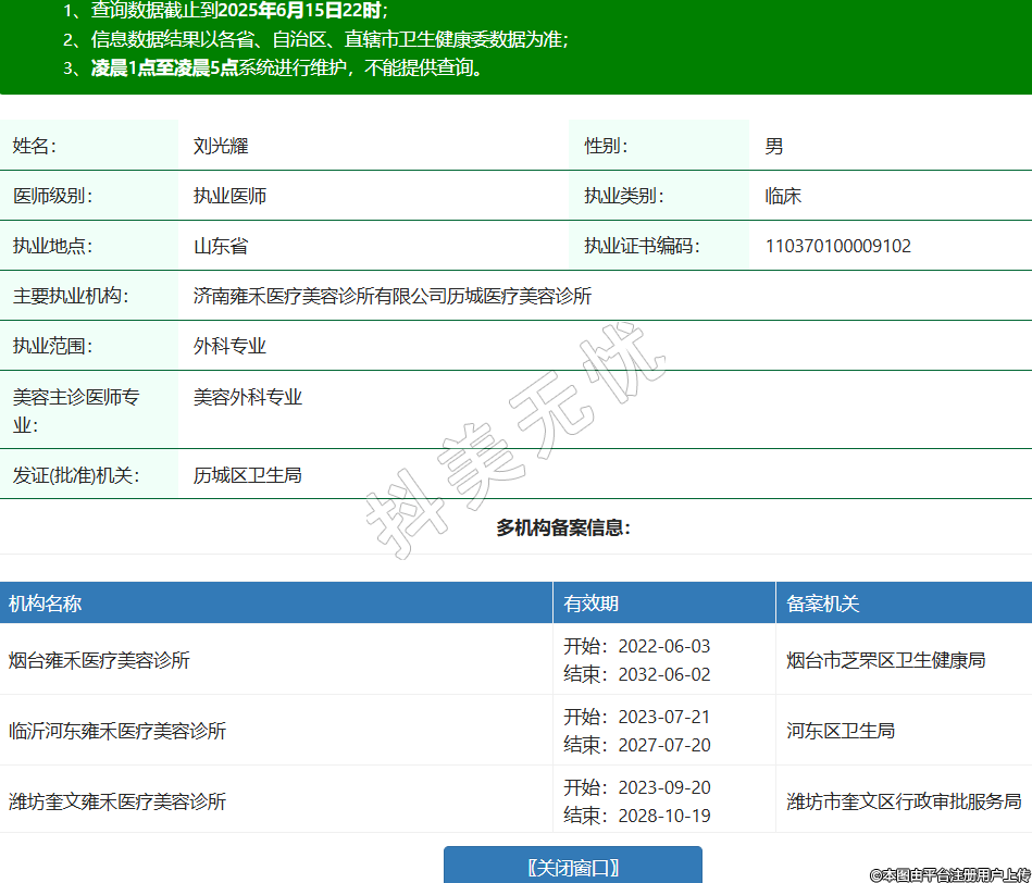 姓名:劉光耀性別:男醫(yī)師級(jí)別:執(zhí)業(yè)醫(yī)師執(zhí)業(yè)類別:臨床執(zhí)業(yè)地點(diǎn):山東省執(zhí)業(yè)證書編碼:110370100009102主要執(zhí)業(yè)機(jī)構(gòu):濟(jì)南雍禾醫(yī)療美容診所有限公司歷城醫(yī)療美容診所執(zhí)業(yè)范圍:外科專業(yè)美容主診醫(yī)師專業(yè):美容外科專業(yè)發(fā)證(批準(zhǔn))機(jī)關(guān):歷城區(qū)衛(wèi)生局多機(jī)構(gòu)備案信息:機(jī)構(gòu)名稱 有效期 備案機(jī)關(guān) 煙臺(tái)雍禾醫(yī)療美容診所 開始:2022-06-03結(jié)束:2032-06-02煙臺(tái)市芝罘區(qū)衛(wèi)生健康局 臨沂河?xùn)|雍禾醫(yī)療美容診所 開始:2023-07-21結(jié)束:2027-07-20河?xùn)|區(qū)衛(wèi)生局 濰坊奎文雍禾醫(yī)療美容診所 開始:2023-09-20結(jié)束:2028-10-19濰坊市奎文區(qū)行政審批服務(wù)局 東營雍禾醫(yī)療美容有限公司雍禾醫(yī)療美容診所 開始:2023-10-17結(jié)束:2026-10-16東營經(jīng)濟(jì)技術(shù)開發(fā)區(qū)審批服務(wù)部 青島雍禾既美醫(yī)療美容有限公司市南醫(yī)療美容診所 開始:2025-04-06結(jié)束:2030-05-06青島市市南區(qū)行政審批服務(wù)局 -