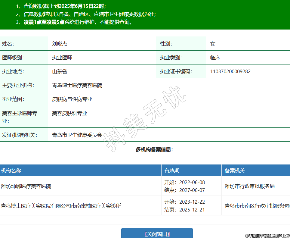 姓名:劉曉杰性別:女醫(yī)師級(jí)別:執(zhí)業(yè)醫(yī)師執(zhí)業(yè)類別:臨床執(zhí)業(yè)地點(diǎn):山東省執(zhí)業(yè)證書編碼:110370200009282主要執(zhí)業(yè)機(jī)構(gòu):青島博士醫(yī)療美容醫(yī)院執(zhí)業(yè)范圍:皮膚病與性病專業(yè)美容主診醫(yī)師專業(yè):美容皮膚科專業(yè)發(fā)證(批準(zhǔn))機(jī)關(guān):青島市衛(wèi)生健康委員會(huì)多機(jī)構(gòu)備案信息:機(jī)構(gòu)名稱 有效期 備案機(jī)關(guān) 濰坊坤娜醫(yī)療美容醫(yī)院 開始:2022-06-08結(jié)束:2027-06-07濰坊市行政審批服務(wù)局 青島博士醫(yī)療美容醫(yī)院有限公司市南蜜柚醫(yī)療美容診所 開始:2023-12-22結(jié)束:2025-12-21青島市市南區(qū)行政審批服務(wù)局 -
