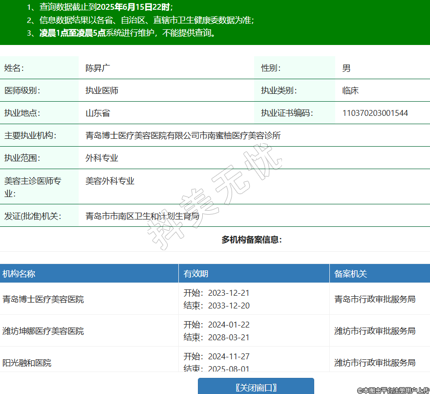 姓名:陳昇廣性別:男醫(yī)師級(jí)別:執(zhí)業(yè)醫(yī)師執(zhí)業(yè)類別:臨床執(zhí)業(yè)地點(diǎn):山東省執(zhí)業(yè)證書編碼:110370203001544主要執(zhí)業(yè)機(jī)構(gòu):青島博士醫(yī)療美容醫(yī)院有限公司市南蜜柚醫(yī)療美容診所執(zhí)業(yè)范圍:外科專業(yè)美容主診醫(yī)師專業(yè):美容外科專業(yè)發(fā)證(批準(zhǔn))機(jī)關(guān):青島市市南區(qū)衛(wèi)生和計(jì)劃生育局多機(jī)構(gòu)備案信息:機(jī)構(gòu)名稱 有效期 備案機(jī)關(guān) 青島博士醫(yī)療美容醫(yī)院 開始:2023-12-21結(jié)束:2033-12-20青島市行政審批服務(wù)局 濰坊坤娜醫(yī)療美容醫(yī)院 開始:2024-01-22結(jié)束:2028-03-21濰坊市行政審批服務(wù)局 陽(yáng)光融和醫(yī)院 開始:2024-11-27結(jié)束:2025-08-01濰坊市行政審批服務(wù)局 -