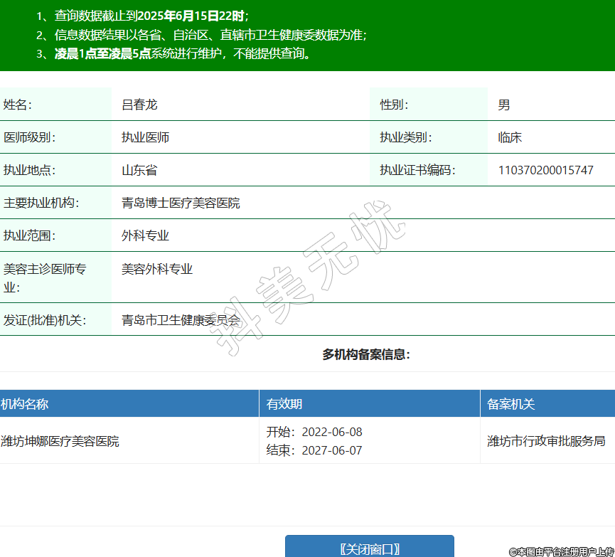 姓名:呂春龍性別:男醫(yī)師級(jí)別:執(zhí)業(yè)醫(yī)師執(zhí)業(yè)類別:臨床執(zhí)業(yè)地點(diǎn):山東省執(zhí)業(yè)證書編碼:110370200015747主要執(zhí)業(yè)機(jī)構(gòu):青島博士醫(yī)療美容醫(yī)院執(zhí)業(yè)范圍:外科專業(yè)美容主診醫(yī)師專業(yè):美容外科專業(yè)發(fā)證(批準(zhǔn))機(jī)關(guān):青島市衛(wèi)生健康委員會(huì)多機(jī)構(gòu)備案信息:機(jī)構(gòu)名稱 有效期 備案機(jī)關(guān) 濰坊坤娜醫(yī)療美容醫(yī)院 開始:2022-06-08結(jié)束:2027-06-07濰坊市行政審批服務(wù)局 -