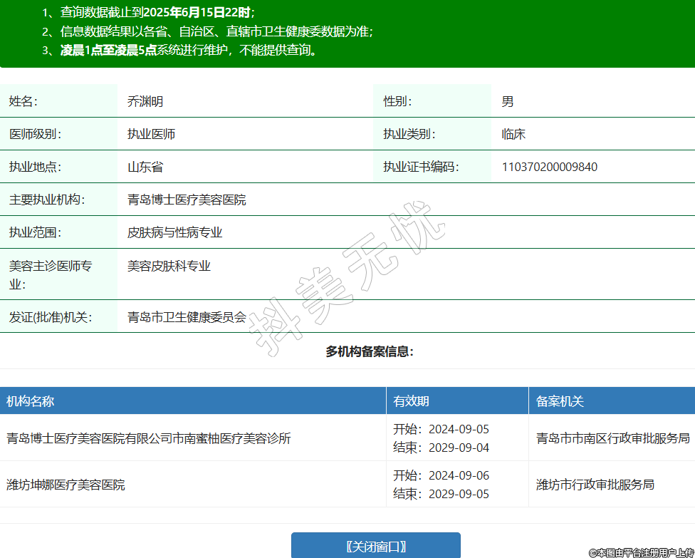 姓名:喬淵明性別:男醫(yī)師級(jí)別:執(zhí)業(yè)醫(yī)師執(zhí)業(yè)類別:臨床執(zhí)業(yè)地點(diǎn):山東省執(zhí)業(yè)證書(shū)編碼:110370200009840主要執(zhí)業(yè)機(jī)構(gòu):青島博士醫(yī)療美容醫(yī)院執(zhí)業(yè)范圍:皮膚病與性病專業(yè)美容主診醫(yī)師專業(yè):美容皮膚科專業(yè)發(fā)證(批準(zhǔn))機(jī)關(guān):青島市衛(wèi)生健康委員會(huì)多機(jī)構(gòu)備案信息:機(jī)構(gòu)名稱 有效期 備案機(jī)關(guān) 青島博士醫(yī)療美容醫(yī)院有限公司市南蜜柚醫(yī)療美容診所 開(kāi)始:2024-09-05結(jié)束:2029-09-04青島市市南區(qū)行政審批服務(wù)局 濰坊坤娜醫(yī)療美容醫(yī)院 開(kāi)始:2024-09-06結(jié)束:2029-09-05濰坊市行政審批服務(wù)局 -