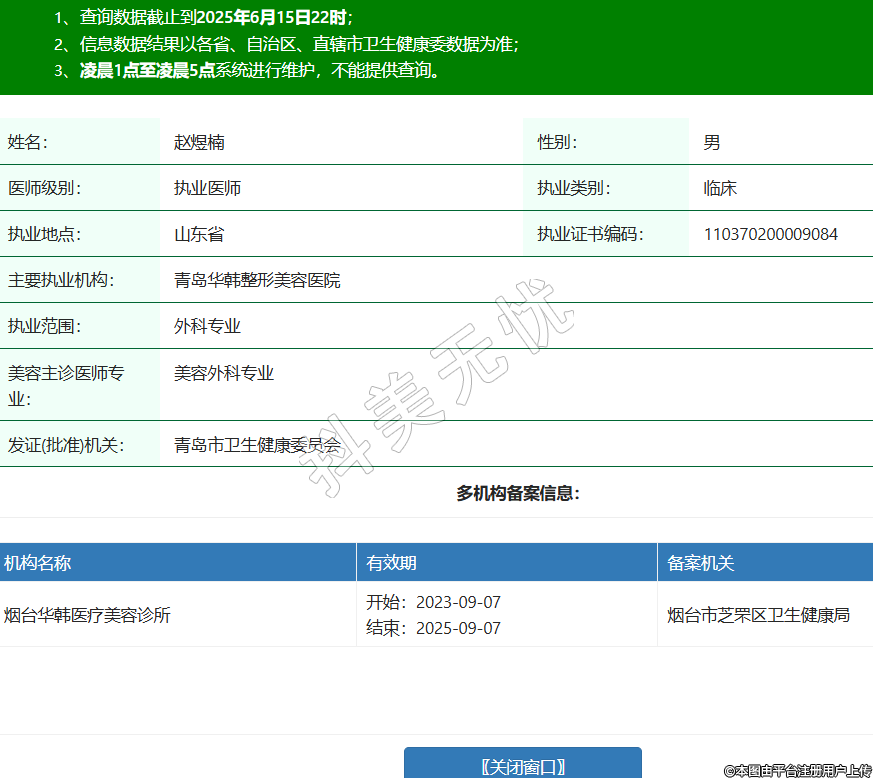 姓名:趙煜楠性別:男醫(yī)師級別:執(zhí)業(yè)醫(yī)師執(zhí)業(yè)類別:臨床執(zhí)業(yè)地點(diǎn):山東省執(zhí)業(yè)證書編碼:110370200009084主要執(zhí)業(yè)機(jī)構(gòu):青島華韓整形美容醫(yī)院執(zhí)業(yè)范圍:外科專業(yè)美容主診醫(yī)師專業(yè):美容外科專業(yè)發(fā)證(批準(zhǔn))機(jī)關(guān):青島市衛(wèi)生健康委員會多機(jī)構(gòu)備案信息:機(jī)構(gòu)名稱 有效期 備案機(jī)關(guān) 煙臺華韓醫(yī)療美容診所 開始:2023-09-07結(jié)束:2025-09-07煙臺市芝罘區(qū)衛(wèi)生健康局 -