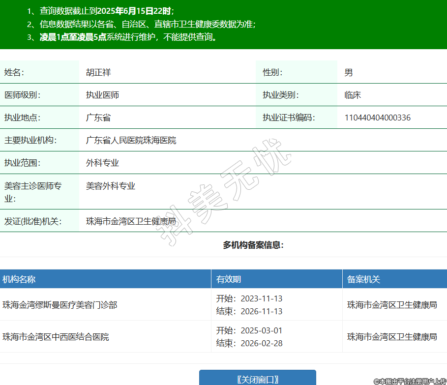 姓名:胡正祥性別:男醫(yī)師級別:執(zhí)業(yè)醫(yī)師執(zhí)業(yè)類別:臨床執(zhí)業(yè)地點(diǎn):廣東省執(zhí)業(yè)證書編碼:110440404000336主要執(zhí)業(yè)機(jī)構(gòu):廣東省人民醫(yī)院珠海醫(yī)院執(zhí)業(yè)范圍:外科專業(yè)美容主診醫(yī)師專業(yè):美容外科專業(yè)發(fā)證(批準(zhǔn))機(jī)關(guān):珠海市金灣區(qū)衛(wèi)生健康局多機(jī)構(gòu)備案信息:機(jī)構(gòu)名稱 有效期 備案機(jī)關(guān) 珠海金灣繆斯曼醫(yī)療美容門診部 開始:2023-11-13結(jié)束:2026-11-13珠海市金灣區(qū)衛(wèi)生健康局 珠海市金灣區(qū)中西醫(yī)結(jié)合醫(yī)院 開始:2025-03-01結(jié)束:2026-02-28珠海市金灣區(qū)衛(wèi)生健康局 -