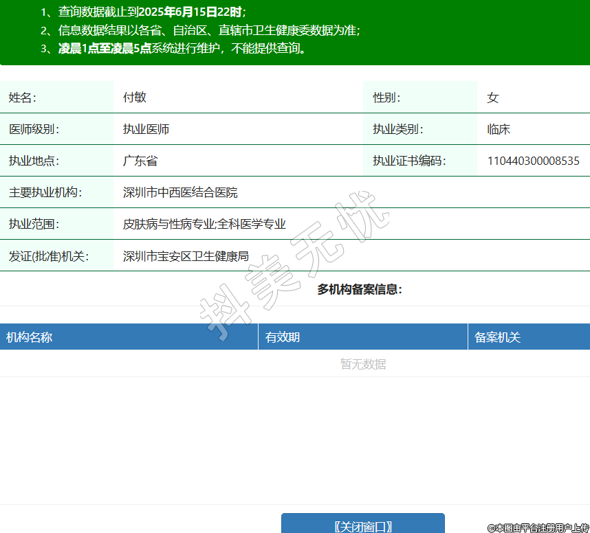 姓名:付敏性別:女醫(yī)師級(jí)別:執(zhí)業(yè)醫(yī)師執(zhí)業(yè)類別:臨床執(zhí)業(yè)地點(diǎn):廣東省執(zhí)業(yè)證書編碼:110440300008535主要執(zhí)業(yè)機(jī)構(gòu):深圳市中西醫(yī)結(jié)合醫(yī)院執(zhí)業(yè)范圍:皮膚病與性病專業(yè);全科醫(yī)學(xué)專業(yè)發(fā)證(批準(zhǔn))機(jī)關(guān):深圳市寶安區(qū)衛(wèi)生健康局 姓名:付敏性別:女醫(yī)師級(jí)別:執(zhí)業(yè)醫(yī)師執(zhí)業(yè)類別:臨床執(zhí)業(yè)地點(diǎn):廣東省執(zhí)業(yè)證書編碼:110440300008535主要執(zhí)業(yè)機(jī)構(gòu):深圳市中西醫(yī)結(jié)合醫(yī)院執(zhí)業(yè)范圍:皮膚病與性病專業(yè);全科醫(yī)學(xué)專業(yè)發(fā)證(批準(zhǔn))機(jī)關(guān):深圳市寶安區(qū)衛(wèi)生健康局