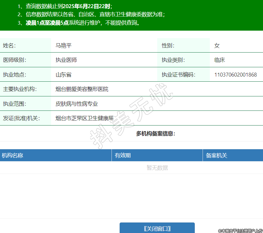 姓名:馬艷平性別:女醫(yī)師級(jí)別:執(zhí)業(yè)醫(yī)師執(zhí)業(yè)類(lèi)別:臨床執(zhí)業(yè)地點(diǎn):山東省執(zhí)業(yè)證書(shū)編碼:110370602001868主要執(zhí)業(yè)機(jī)構(gòu):煙臺(tái)鵬愛(ài)美容整形醫(yī)院執(zhí)業(yè)范圍:皮膚病與性病專(zhuān)業(yè)發(fā)證(批準(zhǔn))機(jī)關(guān):煙臺(tái)市芝罘區(qū)衛(wèi)生健康局 -