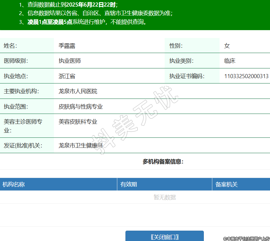 姓名:季露露性別:女醫(yī)師級別:執(zhí)業(yè)醫(yī)師執(zhí)業(yè)類別:臨床執(zhí)業(yè)地點(diǎn):浙江省執(zhí)業(yè)證書編碼:110332502000313主要執(zhí)業(yè)機(jī)構(gòu):龍泉市人民醫(yī)院執(zhí)業(yè)范圍:皮膚病與性病專業(yè)美容主診醫(yī)師專業(yè):美容皮膚科專業(yè)發(fā)證(批準(zhǔn))機(jī)關(guān):龍泉市衛(wèi)生健康局
