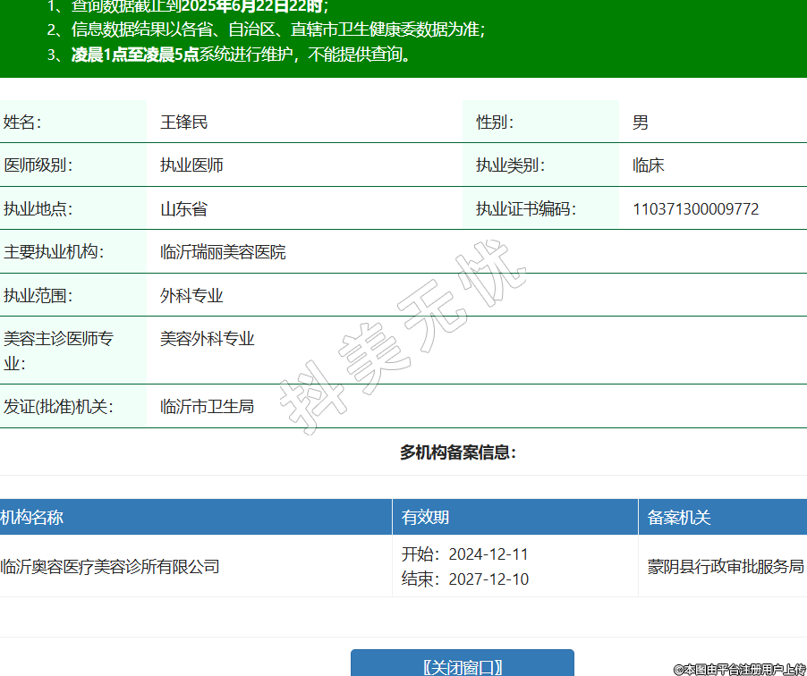 姓名:王鋒民性別:男醫(yī)師級別:執(zhí)業(yè)醫(yī)師執(zhí)業(yè)類別:臨床執(zhí)業(yè)地點:山東省執(zhí)業(yè)證書編碼:110371300009772主要執(zhí)業(yè)機構(gòu):臨沂瑞麗美容醫(yī)院執(zhí)業(yè)范圍:外科專業(yè)美容主診醫(yī)師專業(yè):美容外科專業(yè)發(fā)證(批準)機關(guān):臨沂市衛(wèi)生局多機構(gòu)備案信息:機構(gòu)名稱 有效期 備案機關(guān) 臨沂奧容醫(yī)療美容診所有限公司 開始:2024-12-11結(jié)束:2027-12-10蒙陰縣行政審批服務(wù)局 -