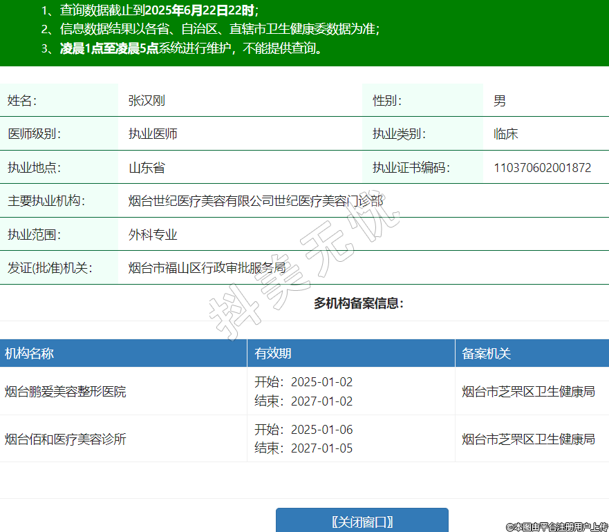 姓名:張漢剛性別:男醫(yī)師級(jí)別:執(zhí)業(yè)醫(yī)師執(zhí)業(yè)類(lèi)別:臨床執(zhí)業(yè)地點(diǎn):山東省執(zhí)業(yè)證書(shū)編碼:110370602001872主要執(zhí)業(yè)機(jī)構(gòu):煙臺(tái)世紀(jì)醫(yī)療美容有限公司世紀(jì)醫(yī)療美容門(mén)診部執(zhí)業(yè)范圍:外科專(zhuān)業(yè)發(fā)證(批準(zhǔn))機(jī)關(guān):煙臺(tái)市福山區(qū)行政審批服務(wù)局多機(jī)構(gòu)備案信息:機(jī)構(gòu)名稱(chēng) 有效期 備案機(jī)關(guān) 煙臺(tái)鵬愛(ài)美容整形醫(yī)院 開(kāi)始:2025-01-02結(jié)束:2027-01-02煙臺(tái)市芝罘區(qū)衛(wèi)生健康局 煙臺(tái)佰和醫(yī)療美容診所 開(kāi)始:2025-01-06結(jié)束:2027-01-05煙臺(tái)市芝罘區(qū)衛(wèi)生健康局 -
