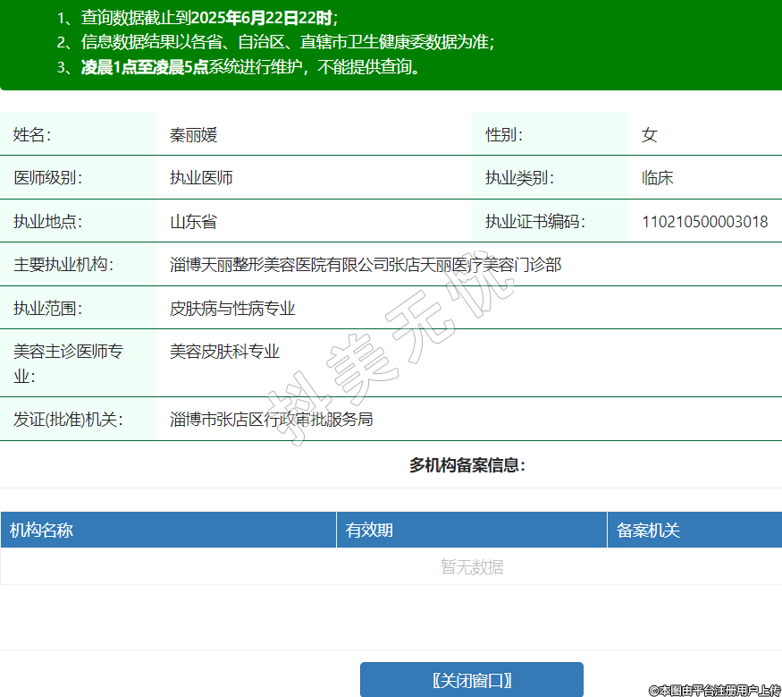 姓名:秦麗媛性別:女醫(yī)師級(jí)別:執(zhí)業(yè)醫(yī)師執(zhí)業(yè)類別:臨床執(zhí)業(yè)地點(diǎn):山東省執(zhí)業(yè)證書編碼:110210500003018主要執(zhí)業(yè)機(jī)構(gòu):淄博天麗整形美容醫(yī)院有限公司張店天麗醫(yī)療美容門診部執(zhí)業(yè)范圍:皮膚病與性病專業(yè)美容主診醫(yī)師專業(yè):美容皮膚科專業(yè)發(fā)證(批準(zhǔn))機(jī)關(guān):淄博市張店區(qū)行政審批服務(wù)局 -
