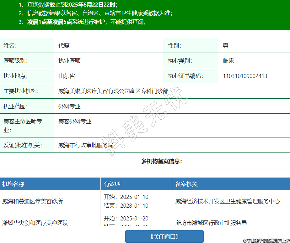 機構(gòu)名稱 有效期 備案機關(guān) 威海和蔓迪醫(yī)療美容診所 開始:2025-01-10結(jié)束:2028-01-10威海經(jīng)濟技術(shù)開發(fā)區(qū)衛(wèi)生健康管理服務(wù)中心 濰城華央創(chuàng)和醫(yī)療美容醫(yī)院 開始:2025-01-20結(jié)束:2026-01-01濰坊市濰城區(qū)行政審批服務(wù)局 威海仙美醫(yī)療美容診所 開始:2025-03-15結(jié)束:2028-03-15威海火炬高技術(shù)產(chǎn)業(yè)開發(fā)區(qū)社會事業(yè)務(wù)局 -