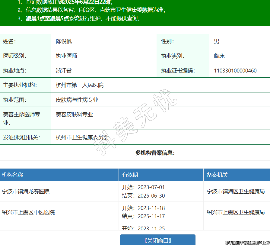 姓名:陳俊帆性別:男醫(yī)師級別:執(zhí)業(yè)醫(yī)師執(zhí)業(yè)類別:臨床執(zhí)業(yè)地點:浙江省執(zhí)業(yè)證書編碼:110330100000460主要執(zhí)業(yè)機構:杭州市第三人民醫(yī)院執(zhí)業(yè)范圍:皮膚病與性病專業(yè)美容主診醫(yī)師專業(yè):美容皮膚科專業(yè)發(fā)證(批準)機關:杭州市衛(wèi)生健康委員會多機構備案信息:機構名稱 有效期 備案機關 寧波市鎮(zhèn)海龍賽醫(yī)院 開始:2023-07-01結束:2025-06-30寧波市鎮(zhèn)海區(qū)衛(wèi)生健康局 紹興市上虞區(qū)中醫(yī)醫(yī)院 開始:2023-11-18結束:2025-11-17紹興市上虞區(qū)衛(wèi)生健康局 杭州市蕭山區(qū)第二人民醫(yī)院 開始:2023-11-25結束:2028-11-24杭州市蕭山區(qū)衛(wèi)生健康局 新昌縣中醫(yī)院 開始:2023-12-15結束:2026-12-01新昌縣衛(wèi)生健康局 永康市第一人民醫(yī)院 開始:2024-01-01結束:2025-12-31永康市衛(wèi)生健康局 杭州市臨平區(qū)中醫(yī)院 開始:2025-02-13結束:2025-12-31杭州市臨平區(qū)衛(wèi)生健康局 -