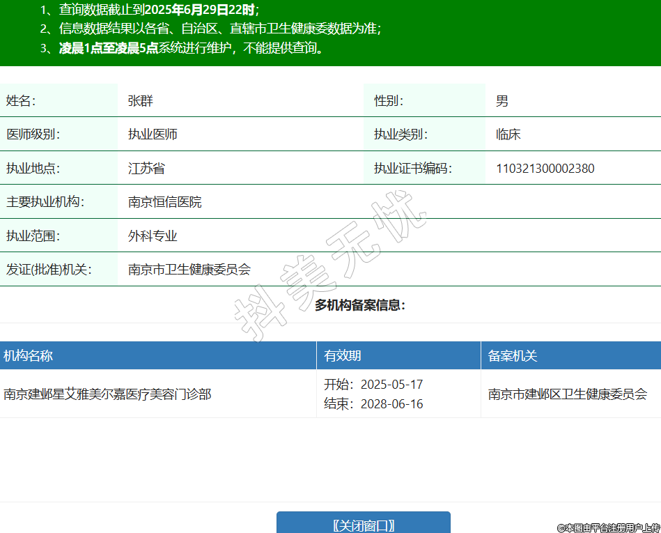 姓名:張群性別:男醫(yī)師級別:執(zhí)業(yè)醫(yī)師執(zhí)業(yè)類別:臨床執(zhí)業(yè)地點:江蘇省執(zhí)業(yè)證書編碼:110321300002380主要執(zhí)業(yè)機構:南京恒信醫(yī)院執(zhí)業(yè)范圍:外科專業(yè)發(fā)證(批準)機關:南京市衛(wèi)生健康委員會多機構備案信息:機構名稱 有效期 備案機關 南京建鄴星艾雅美爾嘉醫(yī)療美容門診部 開始:2025-05-17結束:2028-06-16南京市建鄴區(qū)衛(wèi)生健康委員會 -
