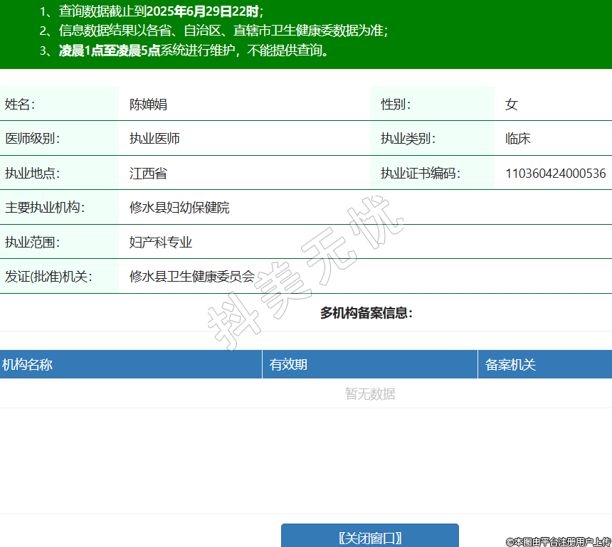 姓名:陳嬋娟性別:女醫(yī)師級(jí)別:執(zhí)業(yè)醫(yī)師執(zhí)業(yè)類別:臨床執(zhí)業(yè)地點(diǎn):江西省執(zhí)業(yè)證書編碼:110360424000536主要執(zhí)業(yè)機(jī)構(gòu):修水縣婦幼保健院執(zhí)業(yè)范圍:婦產(chǎn)科專業(yè)發(fā)證(批準(zhǔn))機(jī)關(guān):修水縣衛(wèi)生健康委員會(huì) -