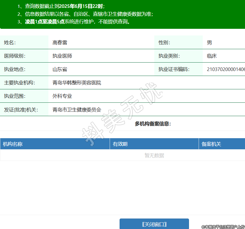 姓名:高春雷性別:男醫(yī)師級別:執(zhí)業(yè)醫(yī)師執(zhí)業(yè)類別:臨床執(zhí)業(yè)地點:山東省執(zhí)業(yè)證書編碼:210370200001406主要執(zhí)業(yè)機構(gòu):青島華韓整形美容醫(yī)院執(zhí)業(yè)范圍:外科專業(yè)發(fā)證(批準)機關(guān):青島市衛(wèi)生健康委員會 -