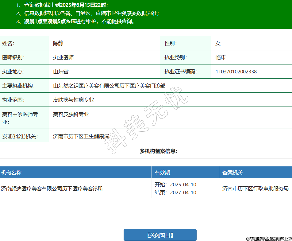 姓名:陳靜性別:女醫(yī)師級別:執(zhí)業(yè)醫(yī)師執(zhí)業(yè)類別:臨床執(zhí)業(yè)地點(diǎn):山東省執(zhí)業(yè)證書編碼:110370102002338主要執(zhí)業(yè)機(jī)構(gòu):山東然之鑰醫(yī)療美容有限公司歷下醫(yī)療美容門診部執(zhí)業(yè)范圍:皮膚病與性病專業(yè)美容主診醫(yī)師專業(yè):美容皮膚科專業(yè)發(fā)證(批準(zhǔn))機(jī)關(guān):濟(jì)南市歷下區(qū)衛(wèi)生健康局多機(jī)構(gòu)備案信息:機(jī)構(gòu)名稱 有效期 備案機(jī)關(guān) 濟(jì)南顏選醫(yī)療美容有限公司歷下醫(yī)療美容診所 開始:2025-04-10結(jié)束:2027-04-10濟(jì)南市歷下區(qū)行政審批服務(wù)局 -