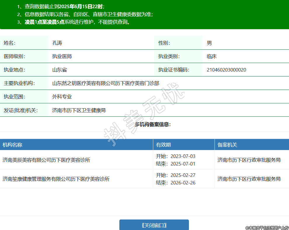 姓名:孔濤性別:男醫(yī)師級別:執(zhí)業(yè)醫(yī)師執(zhí)業(yè)類別:臨床執(zhí)業(yè)地點:山東省執(zhí)業(yè)證書編碼:210460203000020主要執(zhí)業(yè)機構(gòu):山東然之鑰醫(yī)療美容有限公司歷下醫(yī)療美容門診部執(zhí)業(yè)范圍:外科專業(yè)發(fā)證(批準(zhǔn))機關(guān):濟南市歷下區(qū)衛(wèi)生健康局多機構(gòu)備案信息:機構(gòu)名稱 有效期 備案機關(guān) 濟南美辰美容有限公司歷下醫(yī)療美容診所 開始:2023-07-03結(jié)束:2025-07-01濟南市歷下區(qū)行政審批服務(wù)局 濟南笙康健康管理服務(wù)有限公司歷下醫(yī)療美容診所 開始:2025-02-27結(jié)束:2026-02-26濟南市歷下區(qū)行政審批服務(wù)局 -