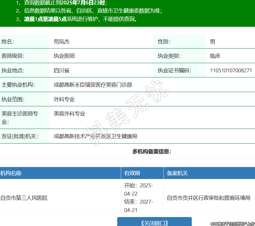 姓名:茍鳳杰性別:男醫(yī)師級別:執(zhí)業(yè)醫(yī)師執(zhí)業(yè)類別:臨床執(zhí)業(yè)地點:四川省執(zhí)業(yè)證書編碼:110510107008271主要執(zhí)業(yè)機構:成都高新禾臣瑞亞醫(yī)療美容門診部執(zhí)業(yè)范圍:外科專業(yè)美容主診醫(yī)師專業(yè):美容外科專業(yè)發(fā)證(批準)機關:成都高新技術產業(yè)開發(fā)區(qū)衛(wèi)生健康局多機構備案信息:機構名稱 有效期 備案機關 自貢市第三人民醫(yī)院 開始:2025-04-22結束:2027-04-21自貢市貢井區(qū)行政審批和營商環(huán)境局 成都青羊蘭妃韻醫(yī)療美容門診部 開始:2025-06-11結束:2027-06-10成都市青羊區(qū)行政審批局(成都市青羊區(qū)政務服務管理和網絡理政辦公室) 志輝醫(yī)院 開始:2025-06-13結束:2027-06-12成都市新津區(qū)行政審批局 成都高新高鑫醫(yī)療美容門診部 開始:2025-06-17結束:2027-06-16成都高新技術產業(yè)開發(fā)區(qū)衛(wèi)生健康局 江油安麗維麗星醫(yī)療美容診所 開始:2025-06-19結束:2027-06-18江油市政務服務和行政審批局 成都武侯華馨聚美綜合門診部 開始:2025-06-23結束:2027-06-22成都市武侯區(qū)行政審批局 資陽雁江儷姿醫(yī)療美容門診部有限公司建設南路醫(yī)療美容門診部 開始:2025-06-24結束:2027-06-23資陽市雁江區(qū)衛(wèi)生健康局 -