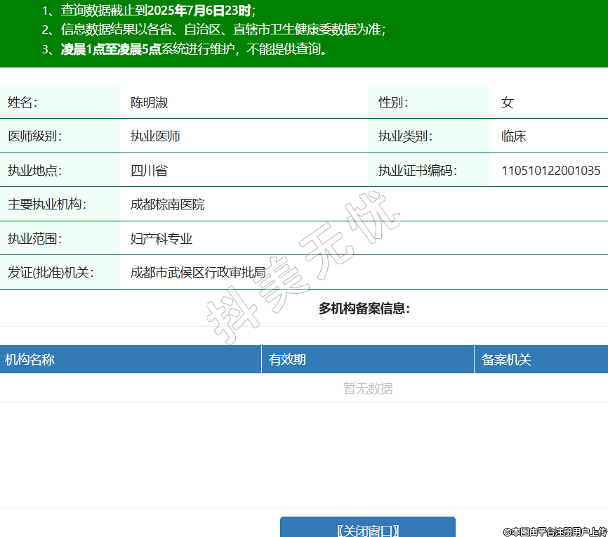 姓名:陳明淑性別:女醫(yī)師級(jí)別:執(zhí)業(yè)醫(yī)師執(zhí)業(yè)類別:臨床執(zhí)業(yè)地點(diǎn):四川省執(zhí)業(yè)證書編碼:110510122001035主要執(zhí)業(yè)機(jī)構(gòu):成都棕南醫(yī)院執(zhí)業(yè)范圍:婦產(chǎn)科專業(yè)發(fā)證(批準(zhǔn))機(jī)關(guān):成都市武侯區(qū)行政審批局 -