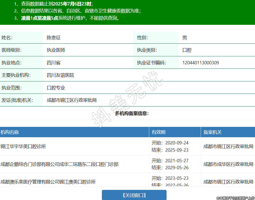 姓名:陳貴征性別:男醫(yī)師級(jí)別:執(zhí)業(yè)醫(yī)師執(zhí)業(yè)類(lèi)別:口腔執(zhí)業(yè)地點(diǎn):四川省執(zhí)業(yè)證書(shū)編碼:120440113000309主要執(zhí)業(yè)機(jī)構(gòu):四川友誼醫(yī)院執(zhí)業(yè)范圍:口腔專(zhuān)業(yè)發(fā)證(批準(zhǔn))機(jī)關(guān):成都市錦江區(qū)行政審批局多機(jī)構(gòu)備案信息:機(jī)構(gòu)名稱(chēng) 有效期 備案機(jī)關(guān) 錦江華宇華美口腔診所 開(kāi)始:2020-09-24結(jié)束:2025-09-23成都市錦江區(qū)行政審批局 成都企鵝綜合門(mén)診部有限公司成華二環(huán)路東二段口腔門(mén)診部 開(kāi)始:2021-05-27結(jié)束:2029-05-26成都市成華區(qū)行政審批局 成都澳樂(lè)美醫(yī)療管理有限公司錦江澳美口腔診所 開(kāi)始:2023-05-23結(jié)束:2027-05-26成都市錦江區(qū)行政審批局 -