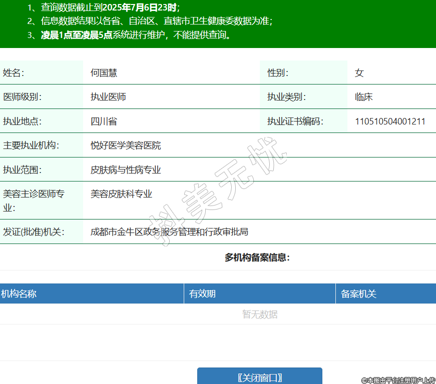 姓名:何國慧性別:女醫(yī)師級別:執(zhí)業(yè)醫(yī)師執(zhí)業(yè)類別:臨床執(zhí)業(yè)地點:四川省執(zhí)業(yè)證書編碼:110510504001211主要執(zhí)業(yè)機構(gòu):悅好醫(yī)學(xué)美容醫(yī)院執(zhí)業(yè)范圍:皮膚病與性病專業(yè)美容主診醫(yī)師專業(yè):美容皮膚科專業(yè)發(fā)證(批準)機關(guān):成都市金牛區(qū)政務(wù)服務(wù)管理和行政審批局 -