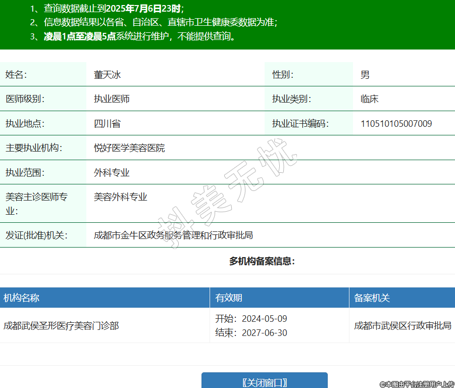 姓名:董天冰性別:男醫(yī)師級(jí)別:執(zhí)業(yè)醫(yī)師執(zhí)業(yè)類別:臨床執(zhí)業(yè)地點(diǎn):四川省執(zhí)業(yè)證書編碼:110510105007009主要執(zhí)業(yè)機(jī)構(gòu):悅好醫(yī)學(xué)美容醫(yī)院執(zhí)業(yè)范圍:外科專業(yè)美容主診醫(yī)師專業(yè):美容外科專業(yè)發(fā)證(批準(zhǔn))機(jī)關(guān):成都市金牛區(qū)政務(wù)服務(wù)管理和行政審批局多機(jī)構(gòu)備案信息:機(jī)構(gòu)名稱 有效期 備案機(jī)關(guān) 成都武侯圣形醫(yī)療美容門診部 開始:2024-05-09結(jié)束:2027-06-30成都市武侯區(qū)行政審批局 -