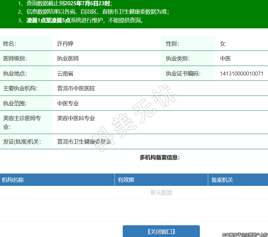 姓名:許丹婷性別:女醫(yī)師級別:執(zhí)業(yè)醫(yī)師執(zhí)業(yè)類別:中醫(yī)執(zhí)業(yè)地點(diǎn):云南省執(zhí)業(yè)證書編碼:141310000010071主要執(zhí)業(yè)機(jī)構(gòu):普洱市中醫(yī)醫(yī)院執(zhí)業(yè)范圍:中醫(yī)專業(yè)美容主診醫(yī)師專業(yè):美容中醫(yī)科專業(yè)發(fā)證(批準(zhǔn))機(jī)關(guān):普洱市衛(wèi)生健康委員會