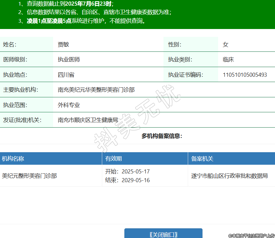 姓名:賈敏性別:女醫(yī)師級別:執(zhí)業(yè)醫(yī)師執(zhí)業(yè)類別:臨床執(zhí)業(yè)地點:四川省執(zhí)業(yè)證書編碼:110510105005493主要執(zhí)業(yè)機構(gòu):南充美紀(jì)元華美整形美容門診部執(zhí)業(yè)范圍:外科專業(yè)發(fā)證(批準(zhǔn))機關(guān):南充市順慶區(qū)衛(wèi)生健康局多機構(gòu)備案信息:機構(gòu)名稱 有效期 備案機關(guān) 美紀(jì)元整形美容門診部 開始:2025-05-17結(jié)束:2029-05-16遂寧市船山區(qū)行政審批和數(shù)據(jù)局 -