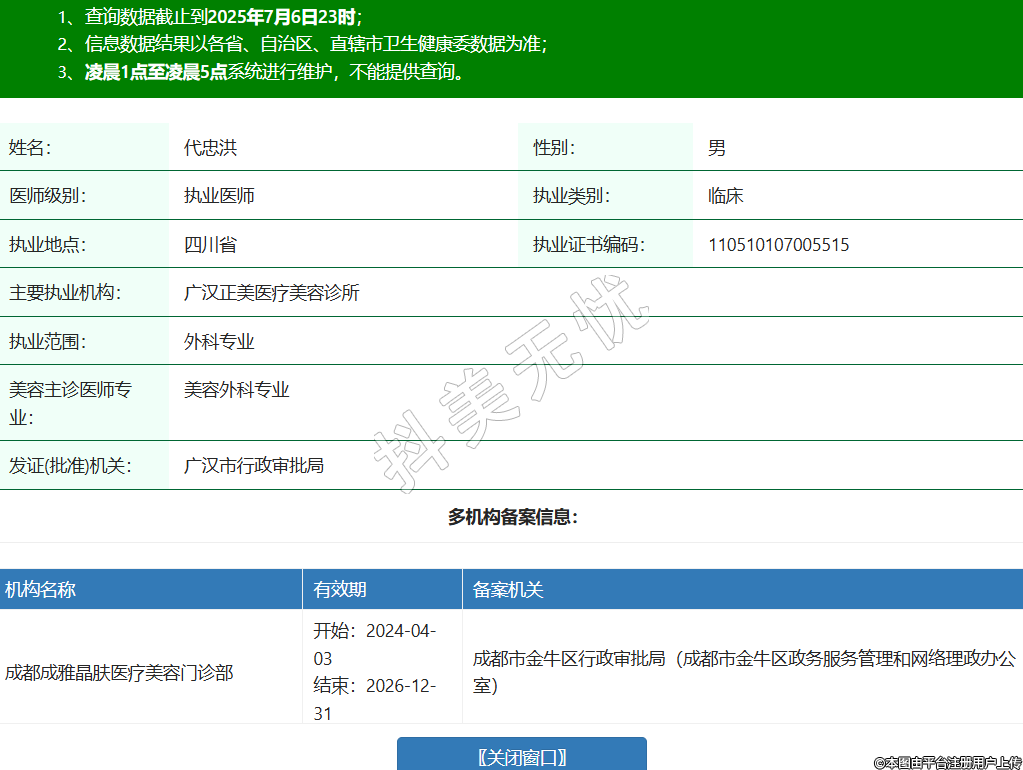 姓名:代忠洪性別:男醫(yī)師級(jí)別:執(zhí)業(yè)醫(yī)師執(zhí)業(yè)類別:臨床執(zhí)業(yè)地點(diǎn):四川省執(zhí)業(yè)證書(shū)編碼:110510107005515主要執(zhí)業(yè)機(jī)構(gòu):廣漢正美醫(yī)療美容診所執(zhí)業(yè)范圍:外科專業(yè)美容主診醫(yī)師專業(yè):美容外科專業(yè)發(fā)證(批準(zhǔn))機(jī)關(guān):廣漢市行政審批局多機(jī)構(gòu)備案信息:機(jī)構(gòu)名稱 有效期 備案機(jī)關(guān) 成都成雅晶膚醫(yī)療美容門(mén)診部 開(kāi)始:2024-04-03結(jié)束:2026-12-31成都市金牛區(qū)行政審批局(成都市金牛區(qū)政務(wù)服務(wù)管理和網(wǎng)絡(luò)理政辦公室) 成都高新中美瑞辰綜合門(mén)診部 開(kāi)始:2024-04-04結(jié)束:2026-12-31成都高新技術(shù)產(chǎn)業(yè)開(kāi)發(fā)區(qū)衛(wèi)生健康局 成都青羊侑姿醫(yī)療美容門(mén)診部 開(kāi)始:2024-04-09結(jié)束:2026-12-08成都市青羊區(qū)行政審批局(成都市青羊區(qū)政務(wù)服務(wù)管理和網(wǎng)絡(luò)理政辦公室) 華人醫(yī)聯(lián)整形美容醫(yī)院 開(kāi)始:2024-04-15結(jié)束:2026-12-31成都市青羊區(qū)行政審批局(成都市青羊區(qū)政務(wù)服務(wù)管理和網(wǎng)絡(luò)理政辦公室) 成都高新熙之環(huán)亞醫(yī)療美容醫(yī)院 開(kāi)始:2024-04-24結(jié)束:2026-12-31成都高新技術(shù)產(chǎn)業(yè)開(kāi)發(fā)區(qū)衛(wèi)生健康局 成都武侯華生鉑悅美容醫(yī)院 開(kāi)始:2024-05-15結(jié)束:2028-12-31成都市武侯區(qū)行政審批局 成都青羊華人醫(yī)聯(lián)為美醫(yī)療美容門(mén)診部 開(kāi)始:2024-07-06結(jié)束:2027-12-31成都市青羊區(qū)行政審批局(成都市青羊區(qū)政務(wù)服務(wù)管理和網(wǎng)絡(luò)理政辦公室) 成都武侯圣形醫(yī)療美容門(mén)診部 開(kāi)始:2024-08-21結(jié)束:2026-12-31成都市武侯區(qū)行政審批局 成都高新科賦麗爾醫(yī)療美容診所 開(kāi)始:2024-10-22結(jié)束:2026-10-31成都高新技術(shù)產(chǎn)業(yè)開(kāi)發(fā)區(qū)衛(wèi)生健康局 -