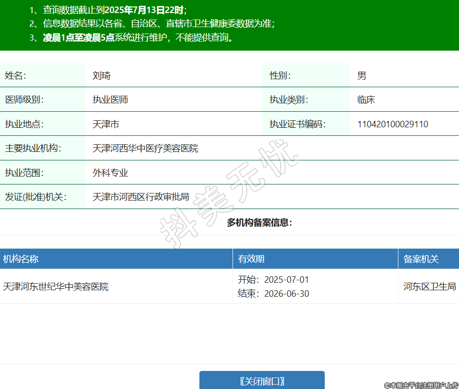 姓名:劉琦性別:男醫(yī)師級別:執(zhí)業(yè)醫(yī)師執(zhí)業(yè)類別:臨床執(zhí)業(yè)地點:天津市執(zhí)業(yè)證書編碼:110420100029110主要執(zhí)業(yè)機構(gòu):天津河西華中醫(yī)療美容醫(yī)院執(zhí)業(yè)范圍:外科專業(yè)發(fā)證(批準(zhǔn))機關(guān):天津市河西區(qū)行政審批局多機構(gòu)備案信息:機構(gòu)名稱 有效期 備案機關(guān) 天津河?xùn)|世紀(jì)華中美容醫(yī)院 開始:2025-07-01結(jié)束:2026-06-30河?xùn)|區(qū)衛(wèi)生局 -
