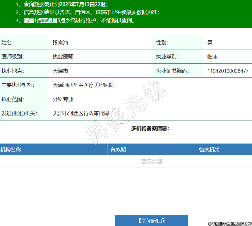 姓名:段家海性別:男醫(yī)師級別:執(zhí)業(yè)醫(yī)師執(zhí)業(yè)類別:臨床執(zhí)業(yè)地點:天津市執(zhí)業(yè)證書編碼:110420100028477主要執(zhí)業(yè)機構(gòu):天津河西華中醫(yī)療美容醫(yī)院執(zhí)業(yè)范圍:外科專業(yè)發(fā)證(批準)機關(guān):天津市河西區(qū)行政審批局 -