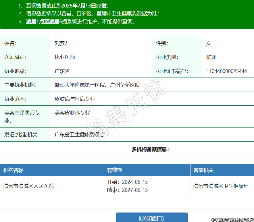姓名:劉賽君性別:女醫(yī)師級(jí)別:執(zhí)業(yè)醫(yī)師執(zhí)業(yè)類別:臨床執(zhí)業(yè)地點(diǎn):廣東省執(zhí)業(yè)證書(shū)編碼:110440000025444主要執(zhí)業(yè)機(jī)構(gòu):暨南大學(xué)附屬第一醫(yī)院、廣州華僑醫(yī)院執(zhí)業(yè)范圍:皮膚病與性病專業(yè)美容主診醫(yī)師專業(yè):美容皮膚科專業(yè)發(fā)證(批準(zhǔn))機(jī)關(guān):廣東省衛(wèi)生健康委員會(huì)多機(jī)構(gòu)備案信息: