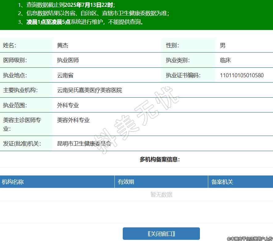 姓名:黃杰性別:男醫(yī)師級(jí)別:執(zhí)業(yè)醫(yī)師執(zhí)業(yè)類別:臨床執(zhí)業(yè)地點(diǎn):云南省執(zhí)業(yè)證書編碼:110110105010580主要執(zhí)業(yè)機(jī)構(gòu):云南吳氏嘉美醫(yī)療美容醫(yī)院執(zhí)業(yè)范圍:外科專業(yè)美容主診醫(yī)師專業(yè):美容外科專業(yè)發(fā)證(批準(zhǔn))機(jī)關(guān):昆明市衛(wèi)生健康委員會(huì) -