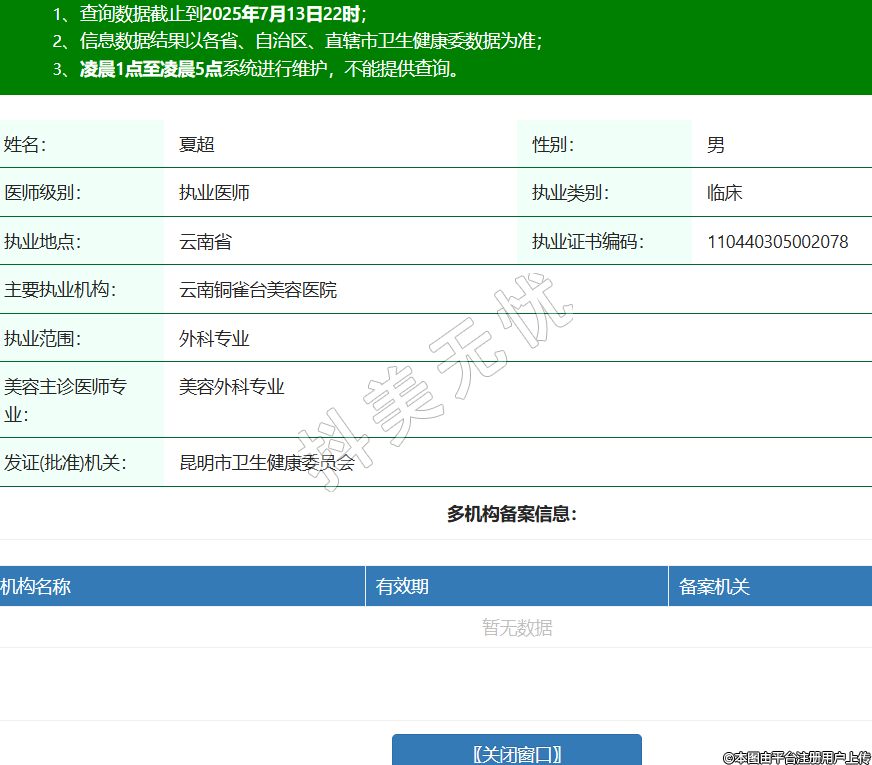 姓名:夏超性別:男醫(yī)師級別:執(zhí)業(yè)醫(yī)師執(zhí)業(yè)類別:臨床執(zhí)業(yè)地點:云南省執(zhí)業(yè)證書編碼:110440305002078主要執(zhí)業(yè)機構(gòu):云南銅雀臺美容醫(yī)院執(zhí)業(yè)范圍:外科專業(yè)美容主診醫(yī)師專業(yè):美容外科專業(yè)發(fā)證(批準)機關(guān):昆明市衛(wèi)生健康委員會 -