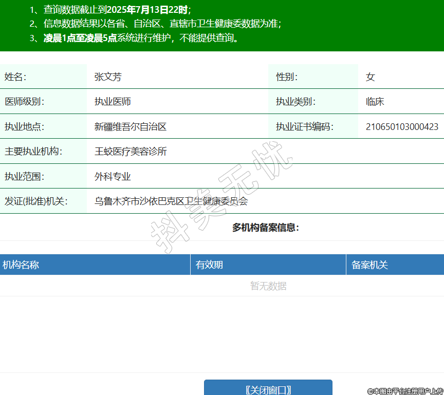 姓名:張文芳性別:女醫(yī)師級(jí)別:執(zhí)業(yè)醫(yī)師執(zhí)業(yè)類(lèi)別:臨床執(zhí)業(yè)地點(diǎn):新疆維吾爾自治區(qū)執(zhí)業(yè)證書(shū)編碼:210650103000423主要執(zhí)業(yè)機(jī)構(gòu):王蛟醫(yī)療美容診所執(zhí)業(yè)范圍:外科專(zhuān)業(yè)發(fā)證(批準(zhǔn))機(jī)關(guān):烏魯木齊市沙依巴克區(qū)衛(wèi)生健康委員會(huì) -