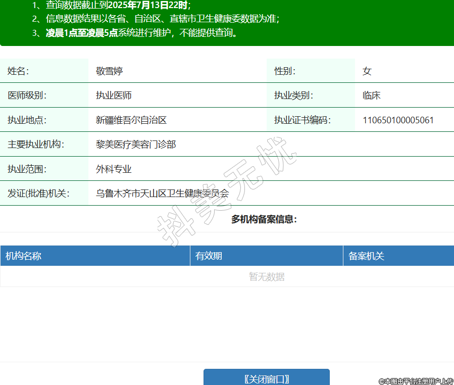 姓名:敬雪婷性別:女醫(yī)師級別:執(zhí)業(yè)醫(yī)師執(zhí)業(yè)類別:臨床執(zhí)業(yè)地點:新疆維吾爾自治區(qū)執(zhí)業(yè)證書編碼:110650100005061主要執(zhí)業(yè)機構(gòu):黎美醫(yī)療美容門診部執(zhí)業(yè)范圍:外科專業(yè)發(fā)證(批準)機關(guān):烏魯木齊市天山區(qū)衛(wèi)生健康委員會 -