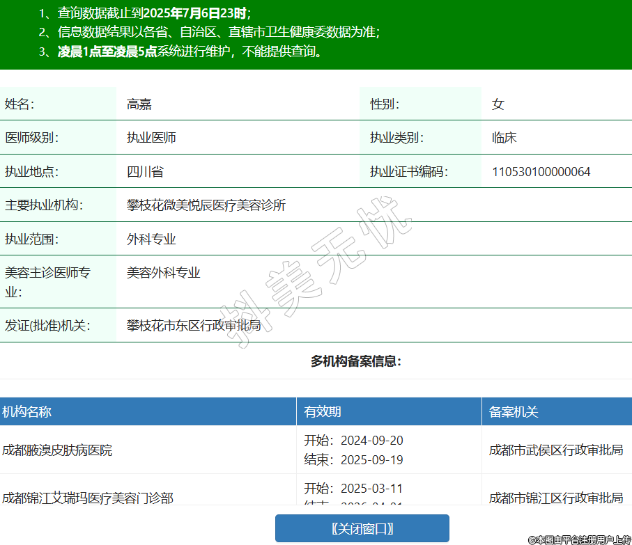 機構(gòu)名稱 有效期 備案機關(guān) 成都腋溴皮膚病醫(yī)院 開始:2024-09-20結(jié)束:2025-09-19成都市武侯區(qū)行政審批局 成都錦江艾瑞瑪醫(yī)療美容門診部 開始:2025-03-11結(jié)束:2026-04-01成都市錦江區(qū)行政審批局 成都成華圣華悅妍醫(yī)療美容診所 開始:2025-06-10結(jié)束:2026-06-09成都市成華區(qū)行政審批局 -