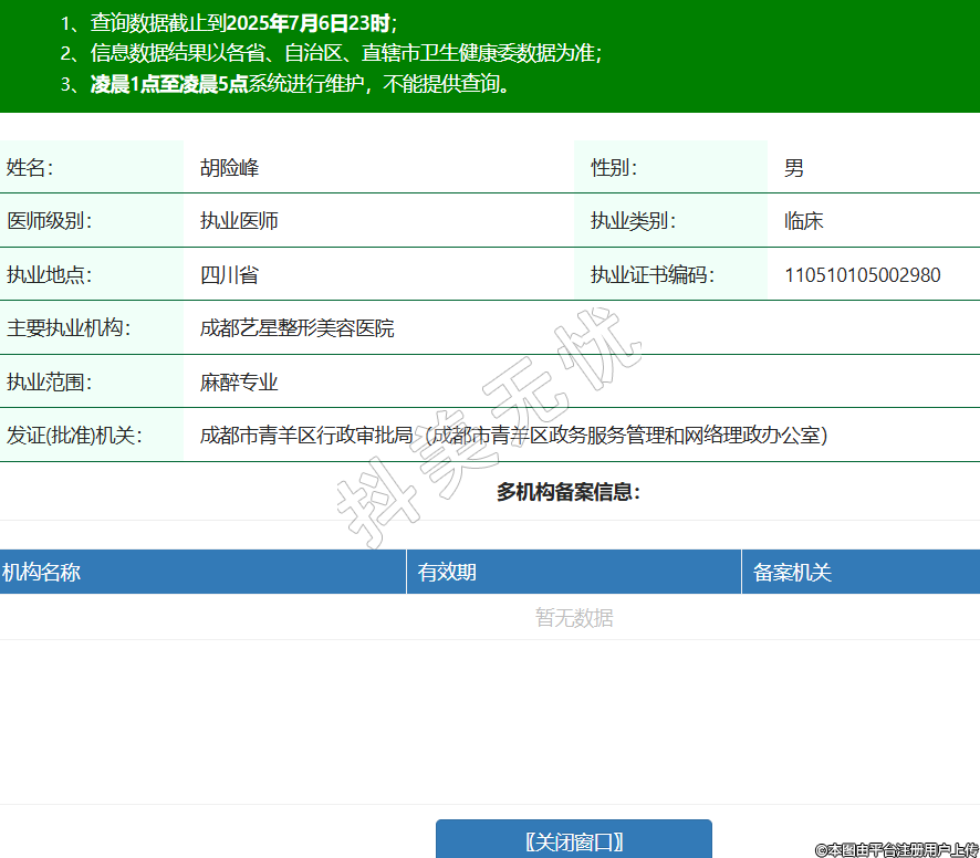 姓名:胡險(xiǎn)峰性別:男醫(yī)師級(jí)別:執(zhí)業(yè)醫(yī)師執(zhí)業(yè)類別:臨床執(zhí)業(yè)地點(diǎn):四川省執(zhí)業(yè)證書(shū)編碼:110510105002980主要執(zhí)業(yè)機(jī)構(gòu):成都藝星整形美容醫(yī)院執(zhí)業(yè)范圍:麻醉專業(yè)發(fā)證(批準(zhǔn))機(jī)關(guān):成都市青羊區(qū)行政審批局(成都市青羊區(qū)政務(wù)服務(wù)管理和網(wǎng)絡(luò)理政辦公室) -