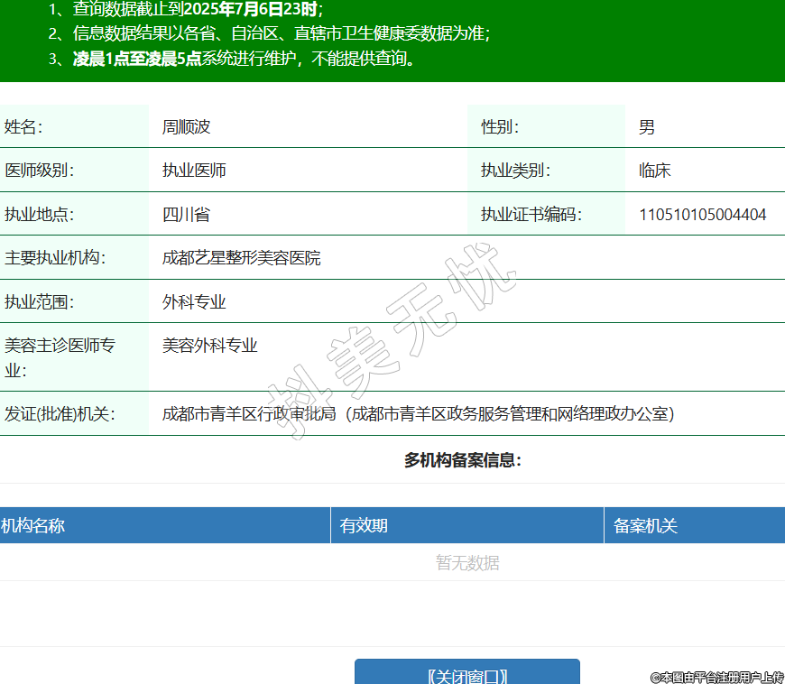 姓名:周順波性別:男醫(yī)師級別:執(zhí)業(yè)醫(yī)師執(zhí)業(yè)類別:臨床執(zhí)業(yè)地點(diǎn):四川省執(zhí)業(yè)證書編碼:110510105004404主要執(zhí)業(yè)機(jī)構(gòu):成都藝星整形美容醫(yī)院執(zhí)業(yè)范圍:外科專業(yè)美容主診醫(yī)師專業(yè):美容外科專業(yè)發(fā)證(批準(zhǔn))機(jī)關(guān):成都市青羊區(qū)行政審批局(成都市青羊區(qū)政務(wù)服務(wù)管理和網(wǎng)絡(luò)理政辦公室) -