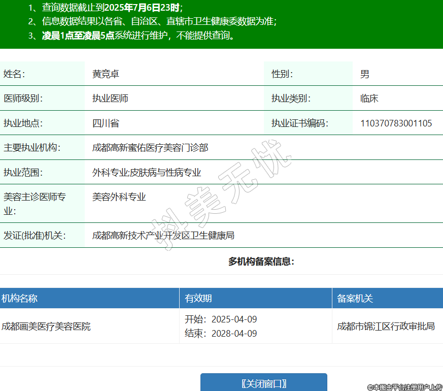 姓名:黃競卓性別:男醫(yī)師級別:執(zhí)業(yè)醫(yī)師執(zhí)業(yè)類別:臨床執(zhí)業(yè)地點:四川省執(zhí)業(yè)證書編碼:110370783001105主要執(zhí)業(yè)機構:成都高新蜜佑醫(yī)療美容門診部執(zhí)業(yè)范圍:外科專業(yè);皮膚病與性病專業(yè)美容主診醫(yī)師專業(yè):美容外科專業(yè)發(fā)證(批準)機關:成都高新技術產(chǎn)業(yè)開發(fā)區(qū)衛(wèi)生健康局多機構備案信息:機構名稱 有效期 備案機關 成都畫美醫(yī)療美容醫(yī)院 開始:2025-04-09結束:2028-04-09成都市錦江區(qū)行政審批局 -