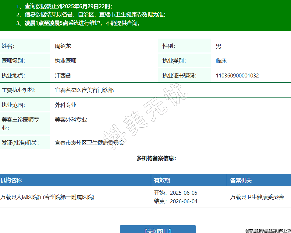 姓名:周紹龍性別:男醫(yī)師級別:執(zhí)業(yè)醫(yī)師執(zhí)業(yè)類別:臨床執(zhí)業(yè)地點:江西省執(zhí)業(yè)證書編碼:110360900001032主要執(zhí)業(yè)機構(gòu):宜春名星醫(yī)療美容門診部執(zhí)業(yè)范圍:外科專業(yè)美容主診醫(yī)師專業(yè):美容外科專業(yè)發(fā)證(批準)機關(guān):宜春市袁州區(qū)衛(wèi)生健康委員會多機構(gòu)備案信息:機構(gòu)名稱 有效期 備案機關(guān) 萬載縣人民醫(yī)院(宜春學(xué)院第一附屬醫(yī)院) 開始:2025-06-05結(jié)束:2026-06-04萬載縣衛(wèi)生健康委員會 -