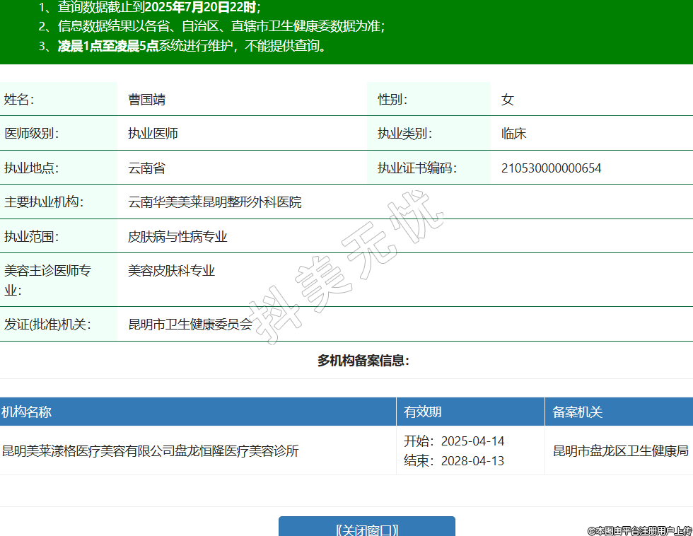 姓名:曹國靖性別:女醫(yī)師級別:執(zhí)業(yè)醫(yī)師執(zhí)業(yè)類別:臨床執(zhí)業(yè)地點(diǎn):云南省執(zhí)業(yè)證書編碼:210530000000654主要執(zhí)業(yè)機(jī)構(gòu):云南華美美萊昆明整形外科醫(yī)院執(zhí)業(yè)范圍:皮膚病與性病專業(yè)美容主診醫(yī)師專業(yè):美容皮膚科專業(yè)發(fā)證(批準(zhǔn))機(jī)關(guān):昆明市衛(wèi)生健康委員會多機(jī)構(gòu)備案信息:機(jī)構(gòu)名稱 有效期 備案機(jī)關(guān) 昆明美萊漾格醫(yī)療美容有限公司盤龍恒隆醫(yī)療美容診所 開始:2025-04-14結(jié)束:2028-04-13昆明市盤龍區(qū)衛(wèi)生健康局 -