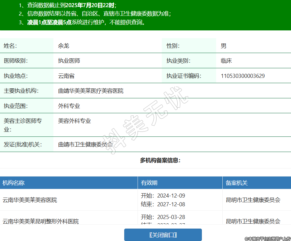 機(jī)構(gòu)名稱 有效期 備案機(jī)關(guān) 云南華美美萊美容醫(yī)院 開始:2024-12-09結(jié)束:2027-12-08昆明市衛(wèi)生健康委員會(huì) 云南華美美萊昆明整形外科醫(yī)院 開始:2025-03-28結(jié)束:2030-03-27昆明市衛(wèi)生健康委員會(huì) -