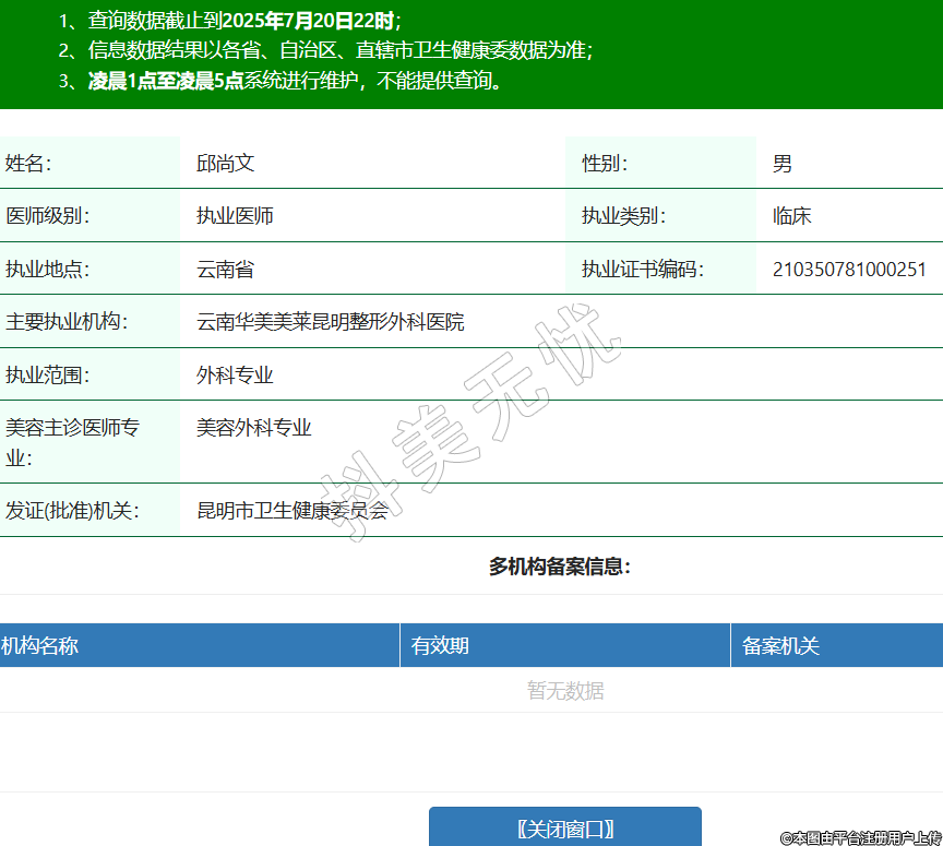 姓名:邱尚文性別:男醫(yī)師級(jí)別:執(zhí)業(yè)醫(yī)師執(zhí)業(yè)類別:臨床執(zhí)業(yè)地點(diǎn):云南省執(zhí)業(yè)證書編碼:210350781000251主要執(zhí)業(yè)機(jī)構(gòu):云南華美美萊昆明整形外科醫(yī)院執(zhí)業(yè)范圍:外科專業(yè)美容主診醫(yī)師專業(yè):美容外科專業(yè)發(fā)證(批準(zhǔn))機(jī)關(guān):昆明市衛(wèi)生健康委員會(huì) -