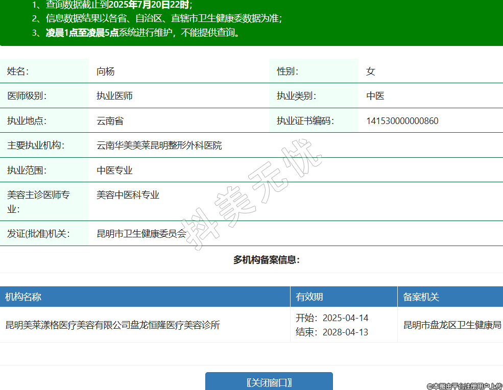 姓名:向楊性別:女醫(yī)師級別:執(zhí)業(yè)醫(yī)師執(zhí)業(yè)類別:中醫(yī)執(zhí)業(yè)地點(diǎn):云南省執(zhí)業(yè)證書編碼:141530000000860主要執(zhí)業(yè)機(jī)構(gòu):云南華美美萊昆明整形外科醫(yī)院執(zhí)業(yè)范圍:中醫(yī)專業(yè)美容主診醫(yī)師專業(yè):美容中醫(yī)科專業(yè)發(fā)證(批準(zhǔn))機(jī)關(guān):昆明市衛(wèi)生健康委員會多機(jī)構(gòu)備案信息:機(jī)構(gòu)名稱 有效期 備案機(jī)關(guān) 昆明美萊漾格醫(yī)療美容有限公司盤龍恒隆醫(yī)療美容診所 開始:2025-04-14結(jié)束:2028-04-13昆明市盤龍區(qū)衛(wèi)生健康局 -