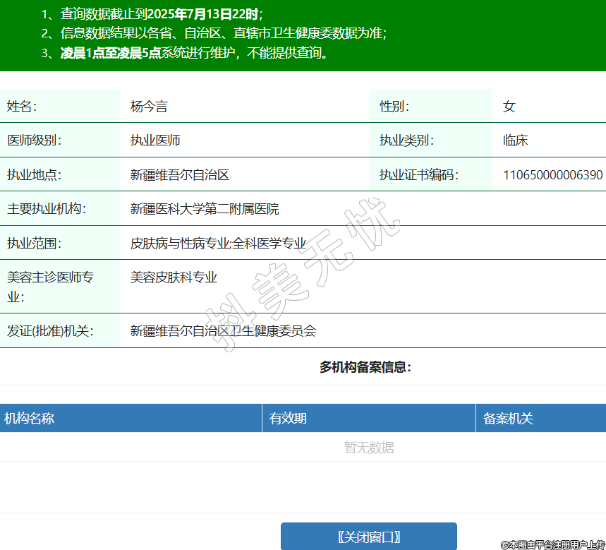 姓名:楊今言性別:女醫(yī)師級(jí)別:執(zhí)業(yè)醫(yī)師執(zhí)業(yè)類別:臨床執(zhí)業(yè)地點(diǎn):新疆維吾爾自治區(qū)執(zhí)業(yè)證書(shū)編碼:110650000006390主要執(zhí)業(yè)機(jī)構(gòu):新疆醫(yī)科大學(xué)第二附屬醫(yī)院執(zhí)業(yè)范圍:皮膚病與性病專業(yè);全科醫(yī)學(xué)專業(yè)美容主診醫(yī)師專業(yè):美容皮膚科專業(yè)發(fā)證(批準(zhǔn))機(jī)關(guān):新疆維吾爾自治區(qū)衛(wèi)生健康委員會(huì) -